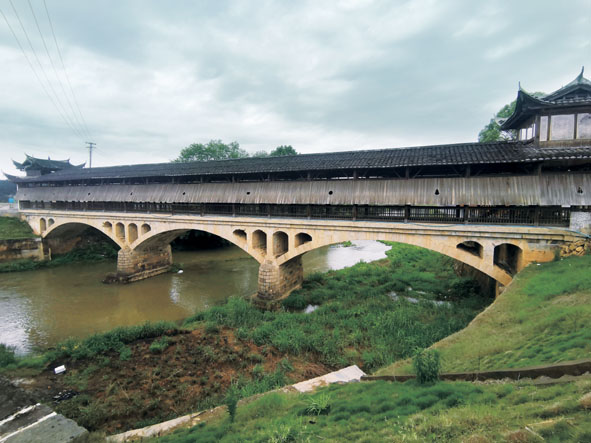 元至正十六年(公元1356年),鄉(xiāng)里人又重建此橋,因地處登仙里,故又名登仙橋。重建后的登云橋,有整形方石砌就的橋墩4個(gè),橋墩上游處呈鷹嘴狀,以減少水的沖擊力。墩上用優(yōu)質(zhì)粗原杉木層疊為梁。梁上鋪木板,再用細(xì)沙、方磚砌成橋面,平坦而穩(wěn)固。橋?qū)?米,全長(zhǎng)60多米。橋上架設(shè)廊屋,青瓦蓋頂。橋兩邊圍半截欄桿,下置條凳。橋中央設(shè)神龕一個(gè),供奉真武神像。其腳踏龜蛇,以示鎮(zhèn)河妖水患乞風(fēng)調(diào)雨順之意。橋北端設(shè)一大神櫥,櫥內(nèi)塑關(guān)公像,左立周倉(cāng),右立關(guān)平。神櫥兩旁有副對(duì)聯(lián),聯(lián)寫“志在春秋功在漢,心同日月義同天”,橫批“肝膽相照”,以歌頌關(guān)公的俠肝義膽。1980年,古橋因破舊被拆除,繼而代之的是座石拱橋。2002年,村民又集資,在石拱橋上建起廊屋。