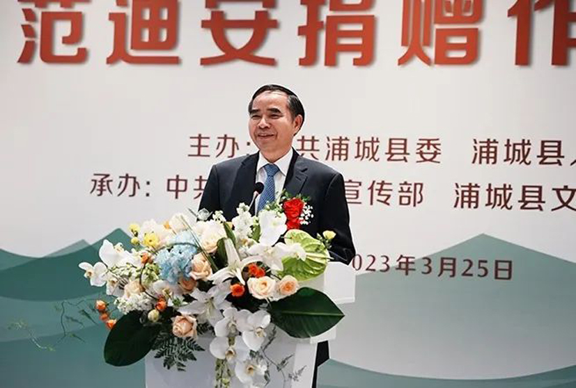 范迪安在致辭中表示,家鄉浦城是青山碧水、鐘靈毓秀之地,自古以來人文歷史積淀深厚,文化傳統養育人才。近年來,南平市委、市政府、浦城縣委、縣政府高度重視精神文明建設和文化傳承創新,以富有前瞻性的規劃布局,為人民群眾高品質生活需求提供文化供給。如今,在古代著名詩人江淹“夢筆生花”的地方建設浦城美術館,不僅讓美術館擁有更加悠遠而濃郁的人文氣息,更是千古文心一脈相承的重要體現。為此,他將捐贈一大批油畫、水彩、書法作品,由浦城美術館永久收藏,同時,還將捐贈一批內容豐富的藝術圖書,在美術館內設立“美育圖書館”,回報家鄉、服務人民,希望能在以文化人、以美育人中發揮應有作用。