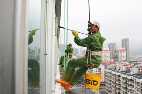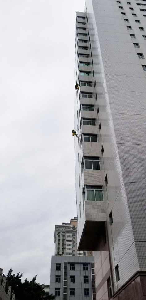 原來,都市中的高樓大廈外墻由于常年受到日曬和風吹雨打,以及大氣中有害的氣體和油煙等污染和化學反應的侵蝕,使得建筑物外墻產生了污垢和風化,既影響了建筑物的標致和市容,又損壞了建筑物。為了城市的整體美觀,在現代都市中滋生出一種新興的行業——高樓外墻清洗。這些“空中飛人”則是利用高空操作繩、安全繩、高空坐板(或吊板、吊籃等)針對大樓外墻材料進行自上而下刷洗清潔制劑、清洗污垢灰塵的高空工作者,從事這種行業的人員必須經過專業培訓并頒發外墻清洗資格證才能上崗。
